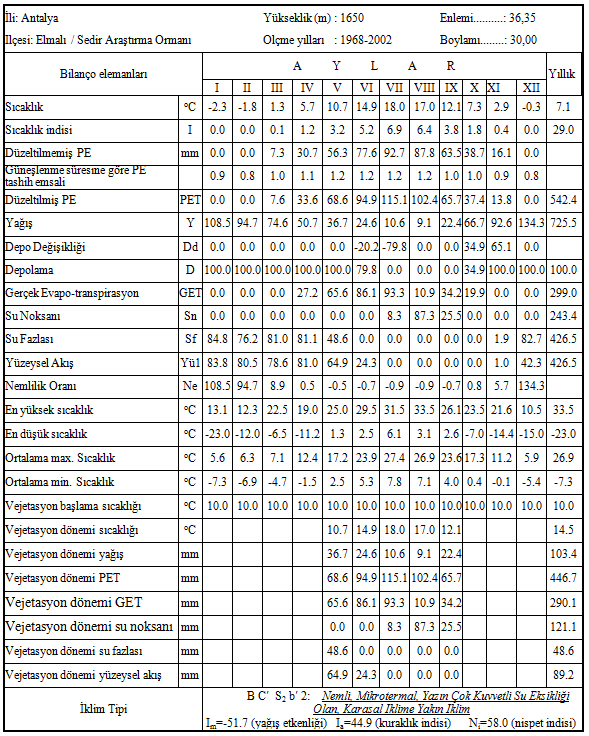Şekil 24. Elmalı Sedir Araştırma Ormanının Thornthwaite Yöntemine Göre Su Bilançosu Analizi ve Meteorolojik Değerleridir.