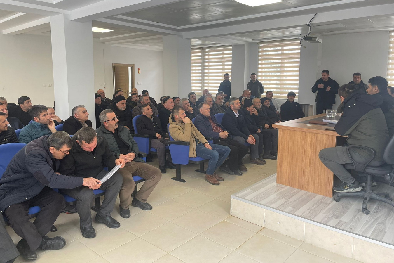 2026 yılı ORKÖY kredileri hakkında başvuruda bulunan 43 köy muhtarının katıldığı toplantıda traktör, tambur, kabuk soyma makinası, katı yakıt kat kaloriferi, süt sığırcılığı, süt koyunculuğu ve dış cephe mantolama kredilerinin dağıtımı yapılacak köylerin belirlenmesi için kura çekimi yapıldı.