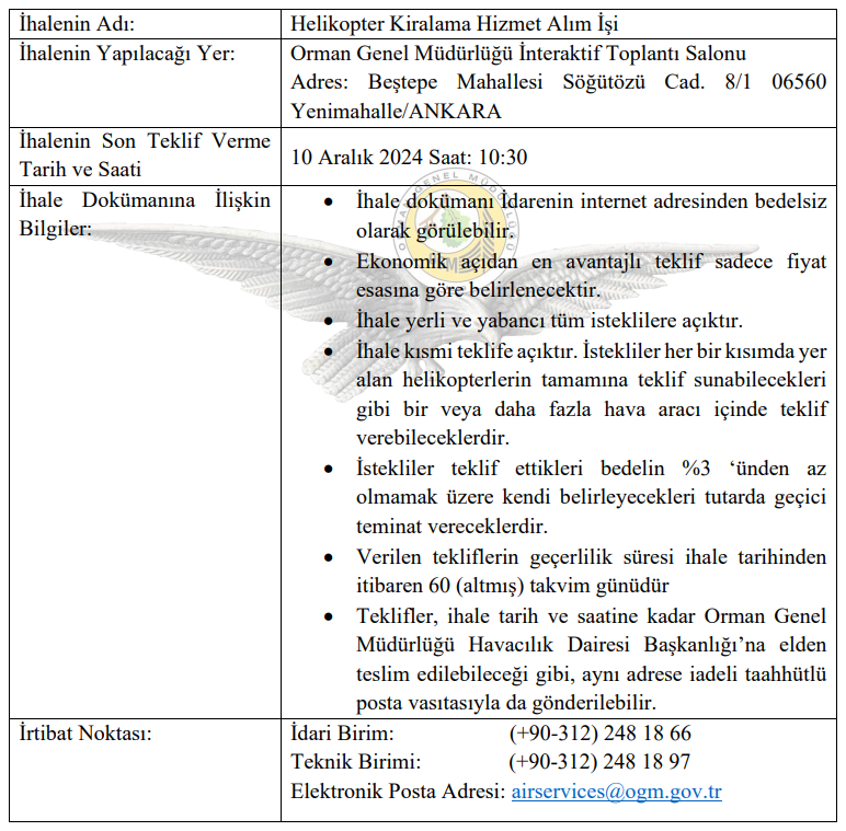 Orman Genel Müdürlüğünce orman yangınlarıyla mücadele faaliyetleri kapsamında kullanmak üzere helikopter kiralaması hizmet alım ihalesi yapılacaktır.