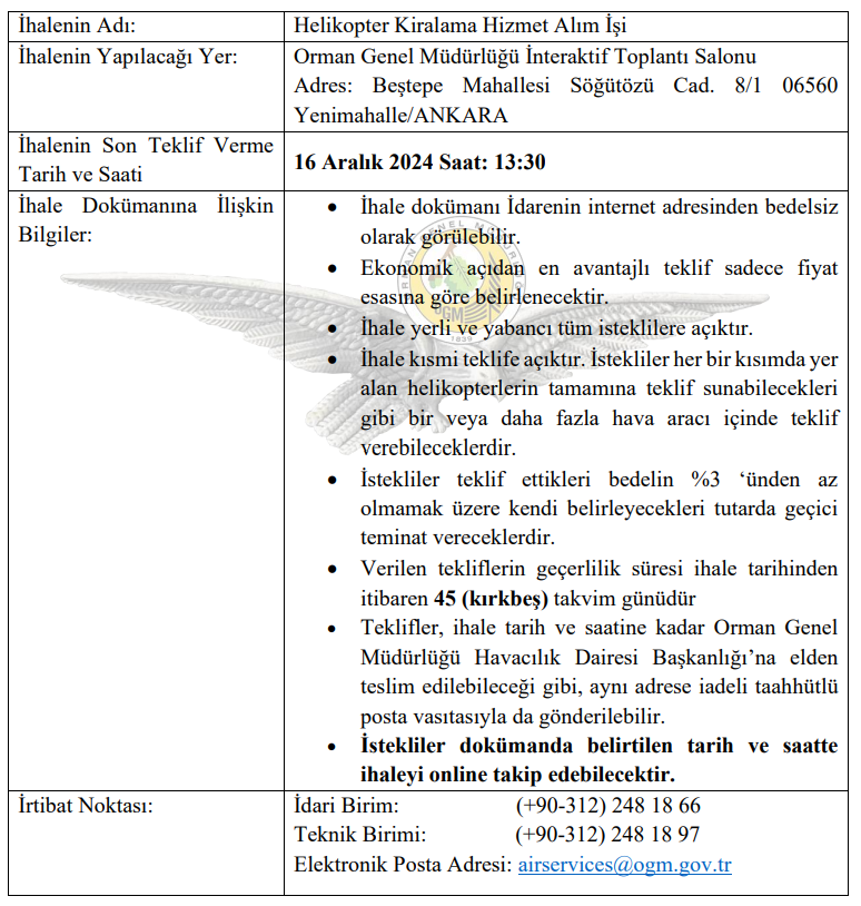 Orman Genel Müdürlüğünce orman yangınlarıyla mücadele faaliyetleri kapsamında kullanmak üzere helikopter kiralaması hizmet alım ihalesi yapılacaktır.