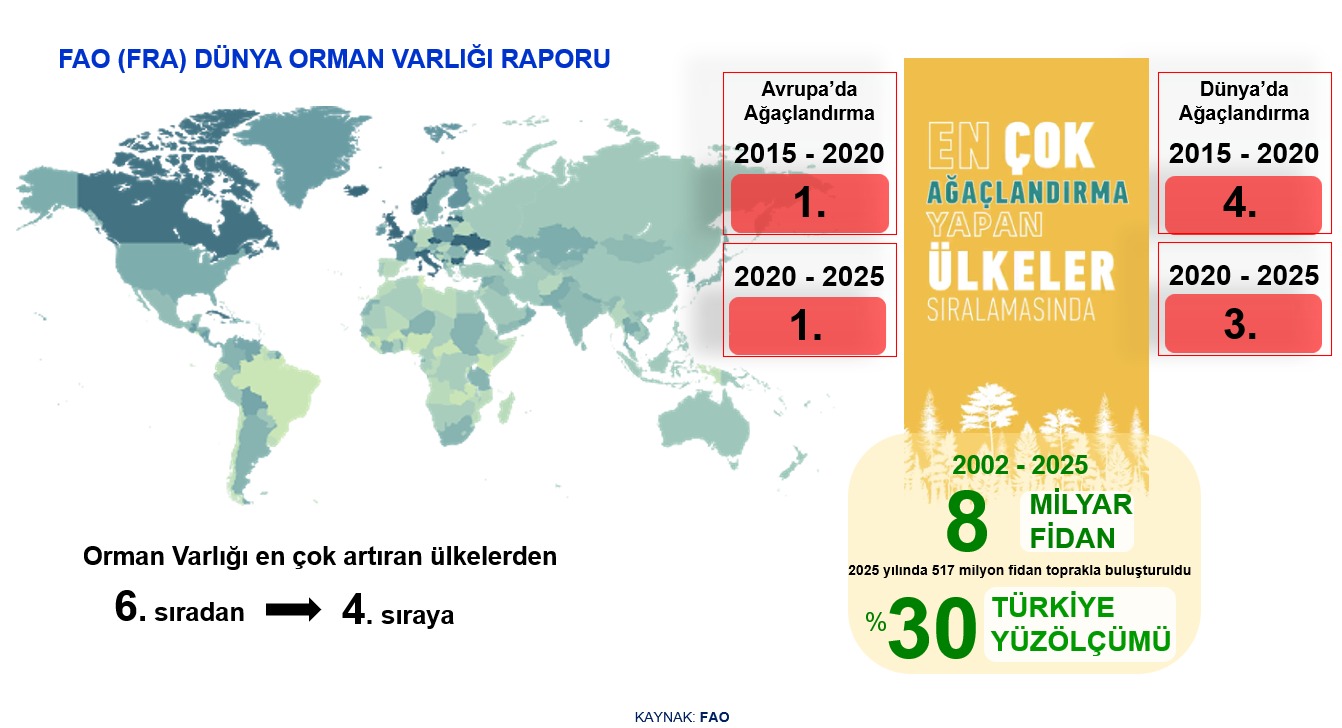 Birleşmiş Milletler Gıda ve Tarım Örgütü'nün (FAO) Küresel Orman Kaynakları Değerlendirme Raporu (FRA) verilerine göre Türkiye, ağaçlandırma çalışmalarında hem Avrupa'da hem de dünyada üst sıralardaki yerini güçlendirdi.FAO verilerine göre Türkiye, 2015–2020 ve 2020–2025 dönemlerinde Avrupa'da en fazla ağaçlandırma yapan ülke oldu. Aynı dönemler itibarıyla dünya genelinde ise 2015–2020 yıllarında 4'üncü, 2020–2025 yıllarında ise 3'üncü sırada yer aldı.